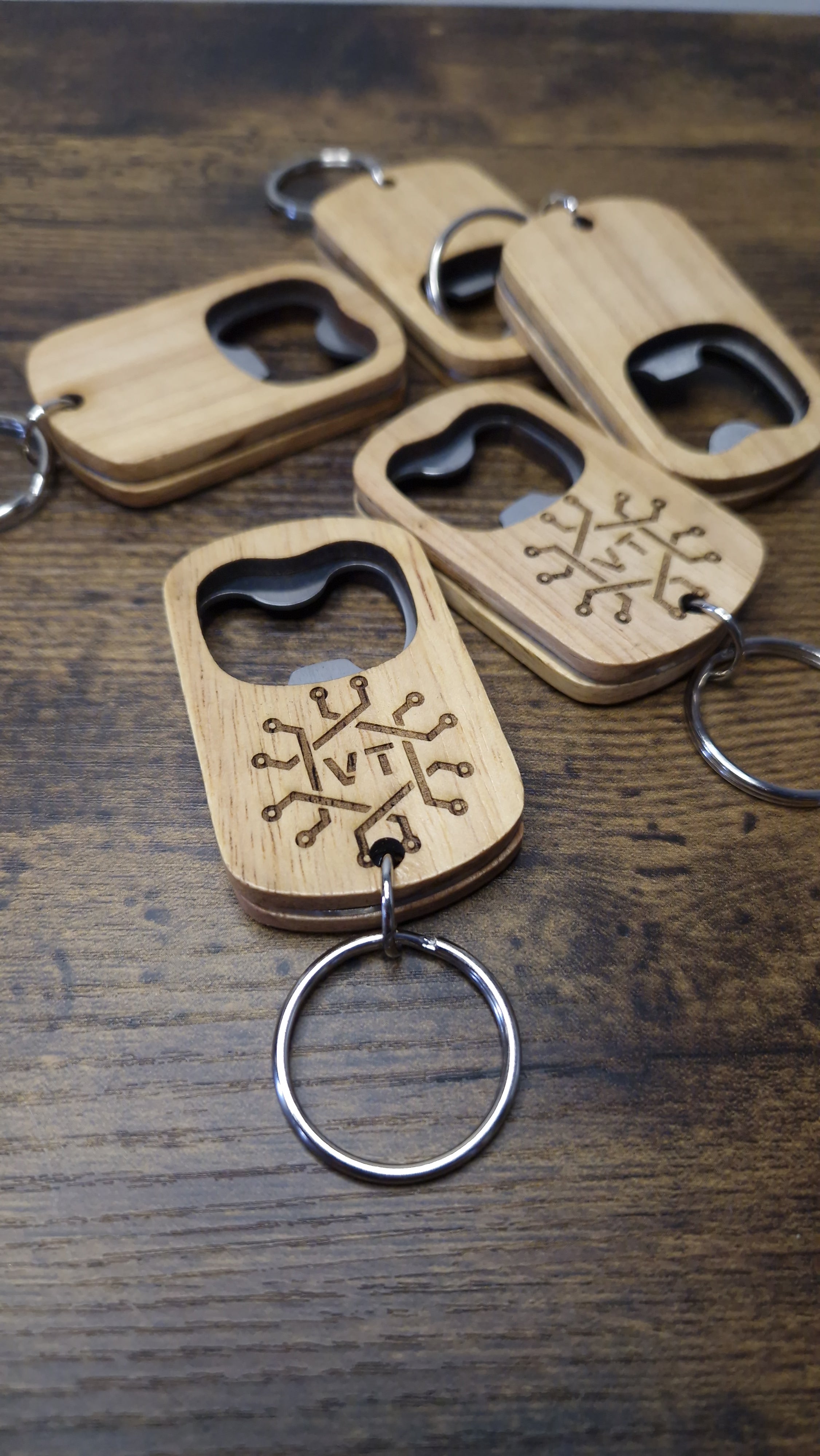 We engrave wood, acrylic, leather, metal (some types), slate, and more. Think: personalized keychains, business signage, trophies, or custom home decor.